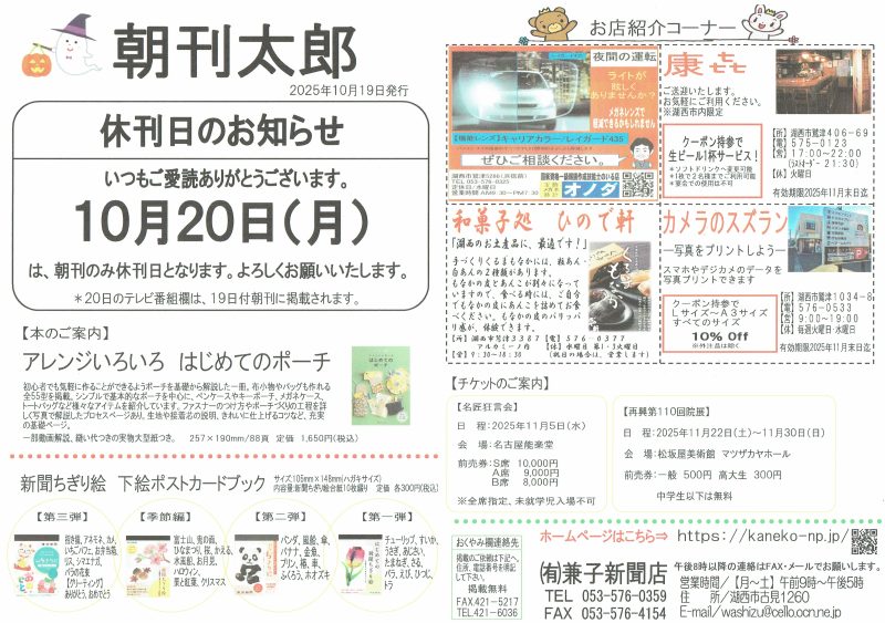 ご注文、お問い合わせは兼子新聞店まで。